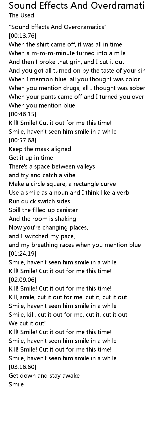 Sound Effects and Overdramatics Lyrics. The The Used Sound Effects And Overdramatics are brought to you by Lyrics-Keeper. When I mention blue all you thought was colour. When the shirt came off it was all in time.